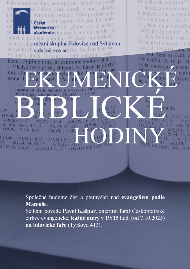 Ekumenické biblické hodiny s Pavlem Kašparem se staly nedílnou součástí života bílovické farnosti v uplynulých letech. Každý, kdo chce lépe rozumět Písmu může přicházet na úterní vyučování. Další cyklus začal v úterý 7. října 2025. Společně budeme číst evangelium podle Matouše a zamýšlet se nad ním. Vždy v úterý v 19:15 hod. ve farní klubovně.