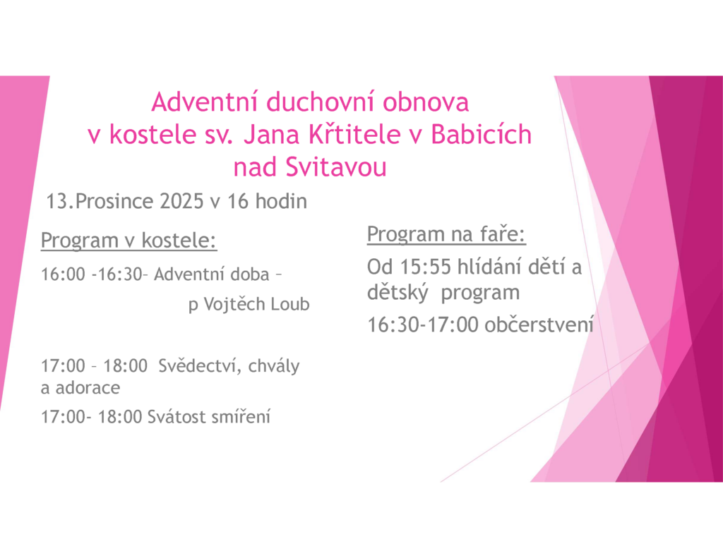 - Sobota 13. prosince 2025: Adventní duchovní obnova v Babicích – v 16 hod. v kostele sv. Jana Křtitele;