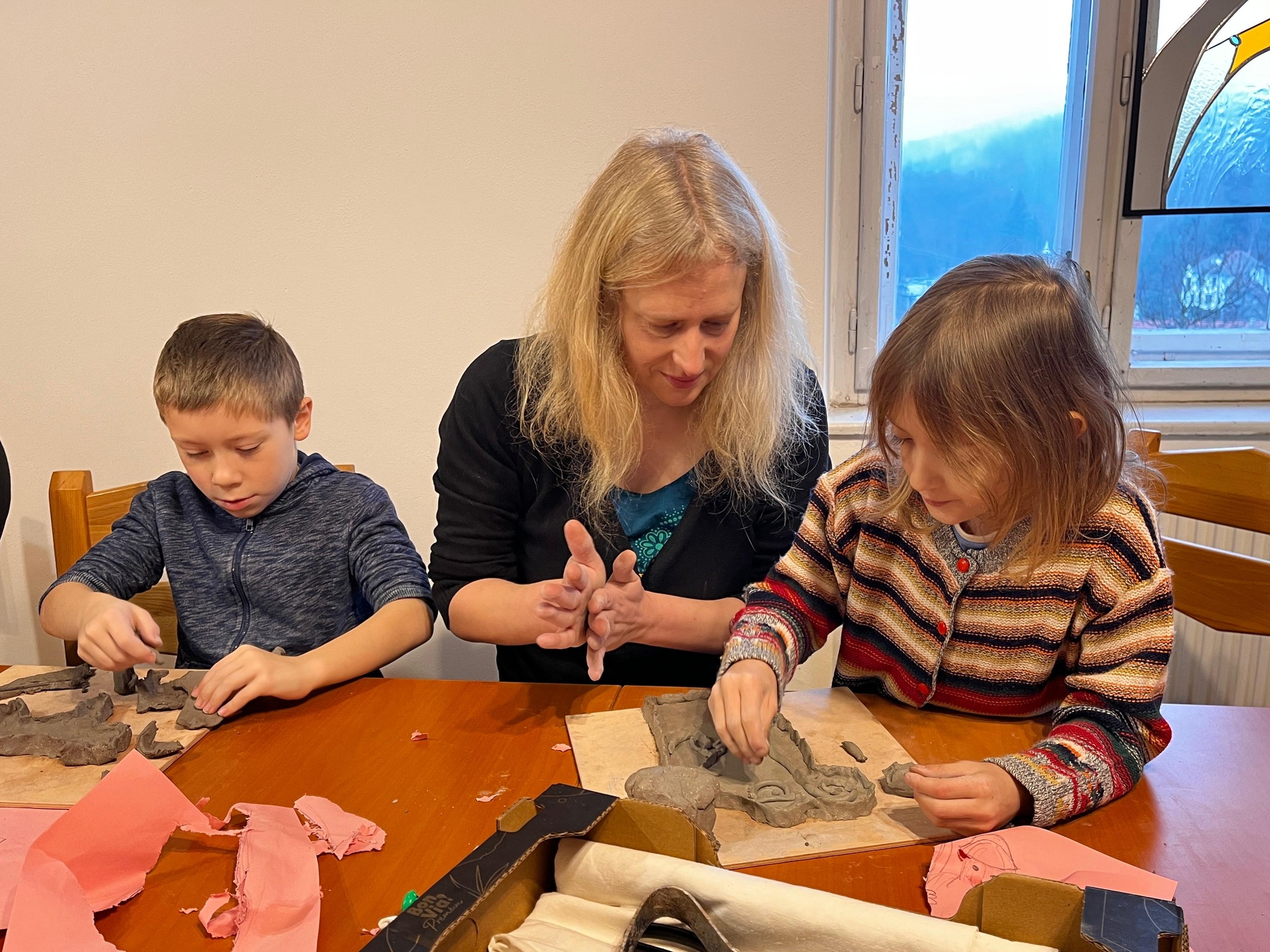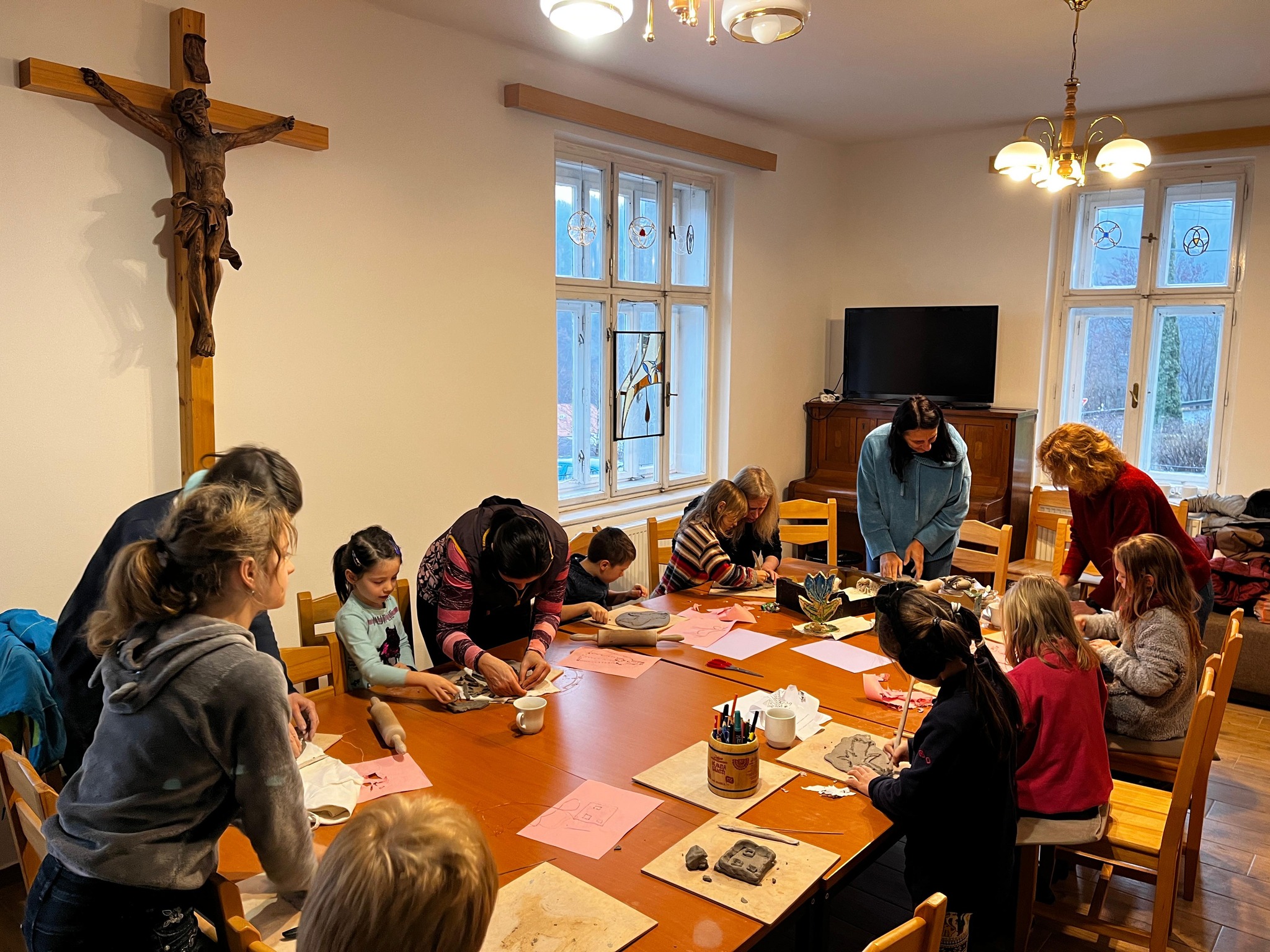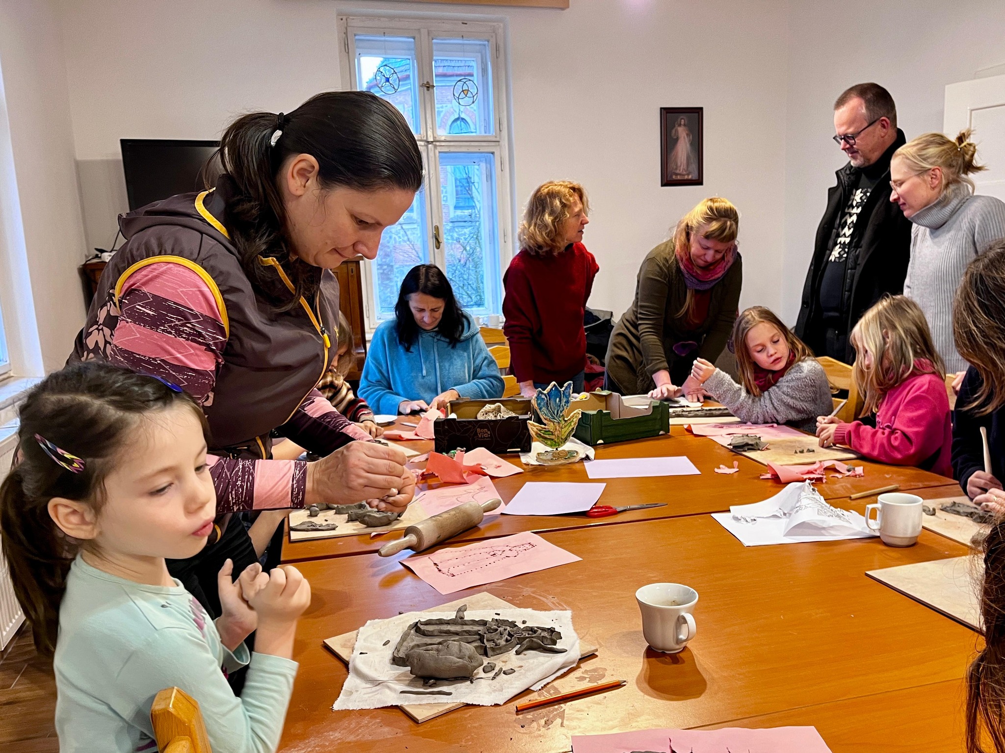 Tři sobotní setkání, tři adventní dílničky pro děti. V 7 hod. roráty, po nich snídaně a pak už se může tvořit. Na tu první dílničku Ola Hořavová připravila vcelku velkou výzvu – postavy do keramického betléma. Nakonec se k dětem přidalo i pár odvážných dospělých. Všichni vytvářeli z hlíny postavy do nového betléma v kostele. A někteří opravdu ukázali veliký talent.