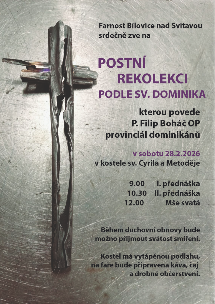 - Sobota 28. února 2026: Postní duchovní obnova s Filipem Boháčem OP – v bílovickém kostele od 9 hod.;