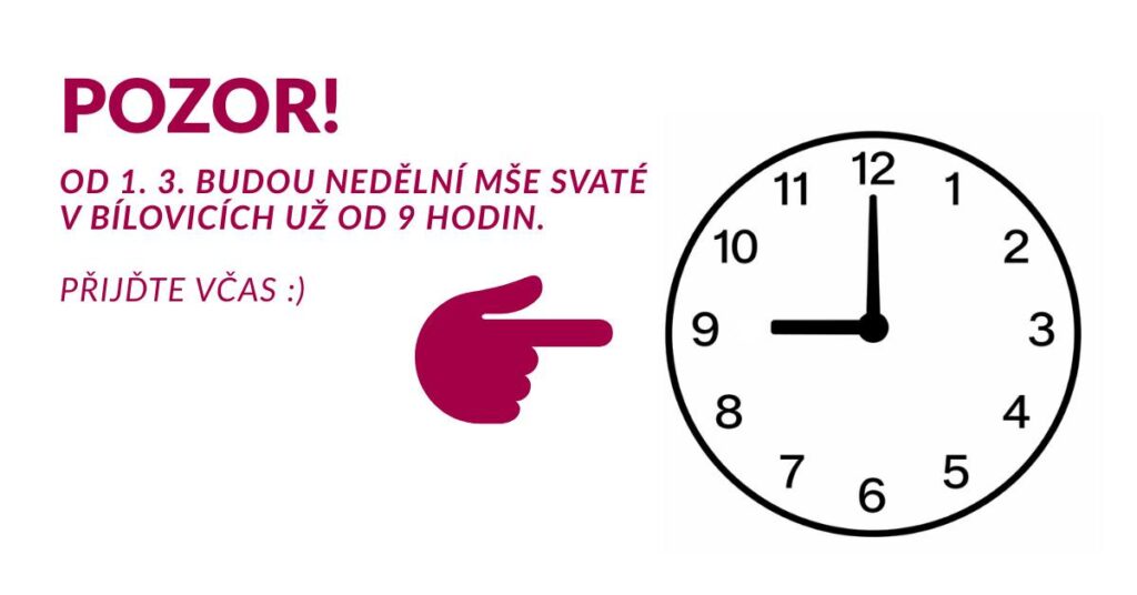 Od neděle 1. března 2026 dochází k výrazné změně v začátku času nedělních bohoslužeb v Bílovicích nad Svitavou a v Babicích nad Svitavou. V obou farnostech tedy bude mše začínat o něco dřív než doposud.